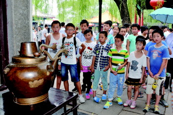 趵突泉景区一把铜壶吸引孩子们驻足观看。