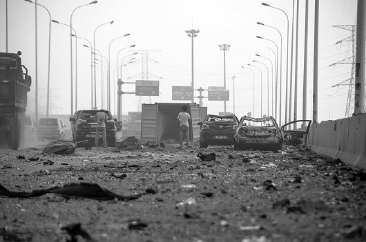 13日,爆炸点附近的滨海高速上一片狼藉。