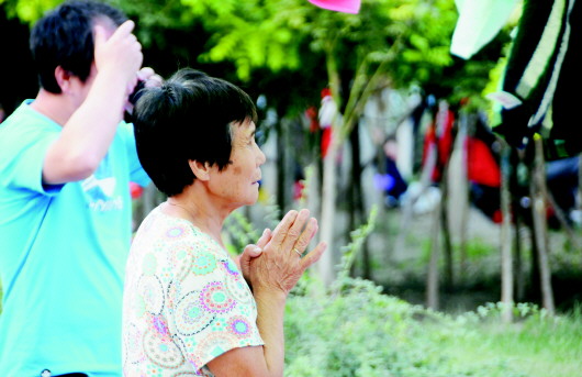 8月17日,警戒线外,向着家的方向双手合十默默祈祷的老人。