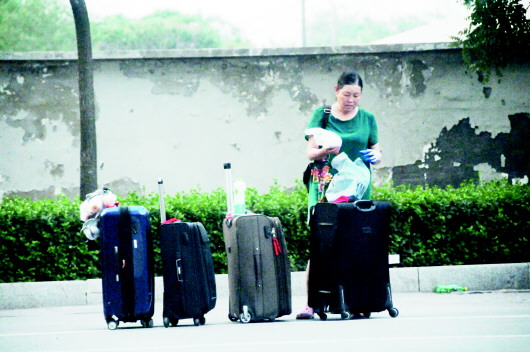 8月15日,开发区第二小学安置点一批河南籍的打工者搭乘塘沽救助站的车辆返乡,两个孩子哭着与妈妈分别,因为妈妈要留下照顾在事故中受伤住院的爸爸。