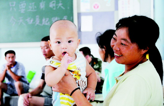 8月16日,在第二小学安置点内,安置在此的居民逗着还不足一岁的孩子。而在他们身后,几位农民工正在商量是否继续留在天津。黑板上写着“只要还有明天,今天就是起跑线”。