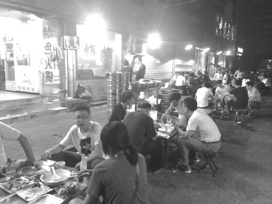 17日晚,十亩园小区路边一家烧烤店,店外的桌子边坐满了人。本报记者 王小蒙 摄