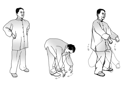 攀跟固肾:展肘,护腰部,大拇指在前,双手推尾膂,沿膀胱经下行至脚前。掐子文握固,下蹲双手如提重物状于两腿前。此动作可固肾益先天。