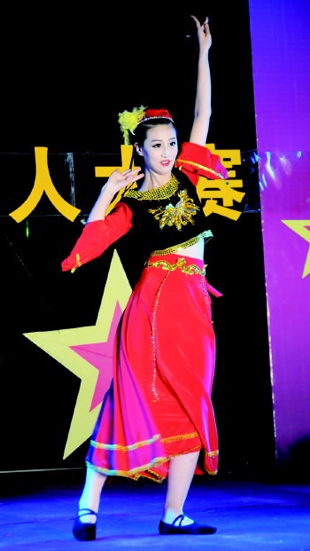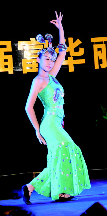 来自艺翌艺术教育学校的毕雅萍一亮相,孔雀羽毛样式的头饰,亮丽的服装,立刻吸引了观众的目光。没有任何舞蹈功底的毕雅萍是第一次登台,也是第一次跳傣族舞,因为时间仓促,这支傣族舞《月亮》只跟着老师学了四天。