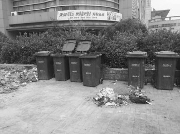 17日,在东地大街与东风路交叉口,原本的地嵌式垃圾箱被填平,取而代之的是可移动的垃圾箱。但有不少市民却嫌麻烦,将垃圾倒在附近地面上,对市容造成不良影响。 本报记者 李慧 摄