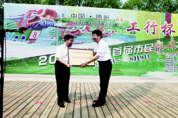 日前,“工行杯”2015德州市首届市民龙舟大赛成功举办。这是工行德州分行积极履行社会责任,热心支持的一项体育赛事,该行全程参与布置展板、现场配套宣传,充分展示了负责任大行的良好形象。图为德州工行党委书记、行长赵忠江接受“支持德州体育事业先进单位”奖牌。 (宋开峰)