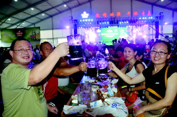 在啤酒节西海岸会场青啤大篷内,游客们正在开怀畅饮。