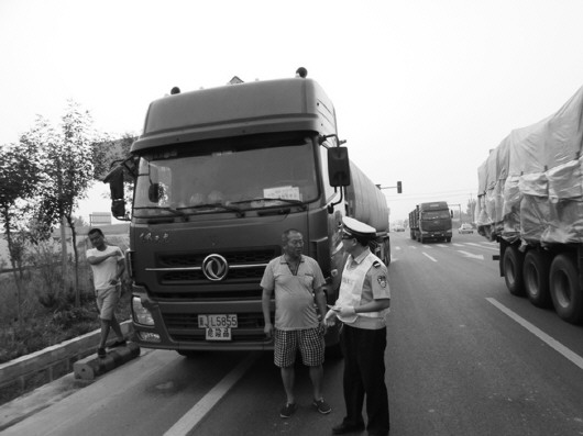 阳信交警对辖区路段危化品运输车辆进行检查。