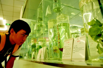 一位参加“用爱圆梦·不一样的暑假”的孩子仔细的观察漱玉平民大药房的药材标本。