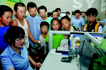 孩子们参观漱玉平民大药房工作人员的工作流程。