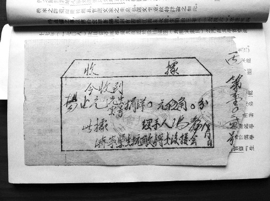 济宁一中图书馆发现的一张学生抗战募捐收据。 济宁一中校友会供图