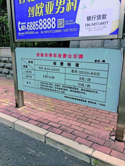 在礼耕路路北头,还立有一块“济南市停车收费公示牌”,其上面所标收费标准与停车计时卡上的收费标准相同。该收费公示牌上明确标示着:“夜间收费,小型汽车5元/次,大型汽车10元/次”。