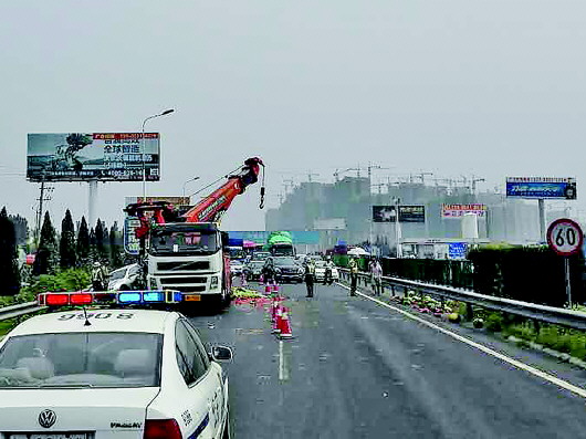 本报96706热线消息(记者 时培磊 通讯员 张敏 实习生 张金波) 8月18日上午10点,在济南方向靠近济南服务区路段,一辆大货车在撞车后发生侧翻,车上3000多斤的西瓜散落了一地。