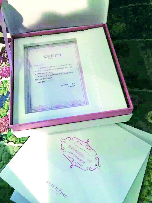最近,小懒一直在为七夕节送啥礼物发愁,她在淘宝网上闲逛时,无意中发现一款可私人定制的爱情保单。店主介绍,这件礼物由定制系列物件与爱情保单组成,定制部分,可将顾客提供的文字和照片印到礼盒中的画册上,而爱情保单则是与国内一家知名保险公司合作,寓意无论双方情感走向如何,这份保障在有效期限内都不变,表达的是“我愿意一直守护你的真心”,比单纯购买保险更显心意。这份爱情保单,以“三年累计保额37.5万”、“五年累计保额62.5万”、“十年累计保额125万”区分,分别售价399元、699元、1314元。小懒介绍,保险主要涉及的是人身安全方面。“最近事故频发,一份保单也是对爱人实实在在的守护。它还有个噱头是在他们店购买的这件礼物一生只能送一个人。还和互联网+结合,打开礼物的同时,可以在微信的幸福墙上以读秒形式进行为期三年的倒计时。”