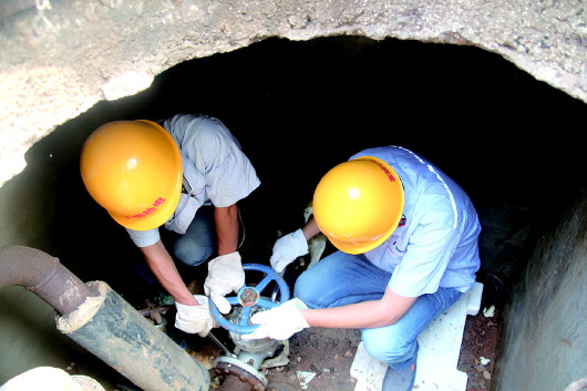 11日,在济南连续一周多连阴、降雨之后,济南又迎来了一个闷热天。上午11点多钟,记者来到位于梁庄大街周边时,看到两名热电的工作人员正在查看路面上的窨井,随后拉开一个窨井盖,“没错,我们需要更换的阀门就在这个窨井内。”一名工作人员说。