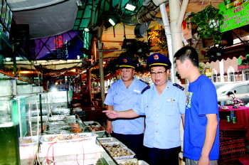 市北区市场监管局登州路所加大对啤酒街监管,每天巡查市场,重点处罚虚假广告和宰客行为。图为18日,执法人员在对商户进行检查。