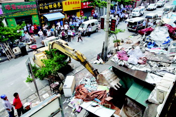 18日,市南区城管、安监、金门路街道办等多部门联合执法,对花莲路2号及基隆路7号周边的12处违法建筑进行拆除,这些违建多为饭店、旅馆等。据介绍,违建中易燃物品堆积,私拉电线情况严重,有餐馆甚至违规使用多个50公斤液化气罐,存在严重安全隐患。