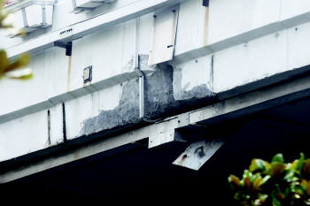 日前,有市民反映杭鞍高架海泊河段桥体出现混凝土脱落问题。18日,在位于联城海岸二期南侧区域,记者看到了市民反映的“问题桥梁段”:位于桥梁下底的伸缩缝位置。与此前市民反映的混凝土破损严重、脱落较多不同,当日混凝土掉落区域已经明显进行过简单修复,新浇筑的砂浆与周边颜色差别明显,但仍留有小部分破损区域。
