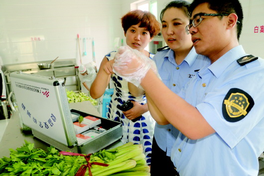 18日,无棣县棣丰街道食品药品监督管理所的执法人员来到辖区内一幼儿园,对食堂刚刚采购的蔬菜进行快检。为进一步提高学校食品安全主体责任意识和食堂规范化管理水平,无棣县食药监管部门启动“学校午餐食品安全工程”,重点加强对学校餐厅的食品安全监管。