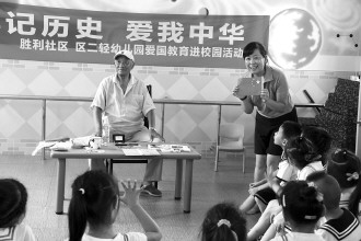 近日,环翠楼街道办胜利社区开展了庆祝抗战胜利70周年爱国主义教育活动。当日,在二轻幼儿园内,30余名小朋友认真地听着抗战老兵孔庆贵讲抗战故事。