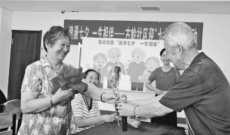 18日上午,古岭社区邀请12对老年夫妻参加“浪漫七夕 相伴一生”主题活动,活动中,老夫妻们携手完成“鼻子嘴巴贴贴贴”、 “击鼓传花”等游戏,重温浪漫爱情。