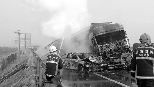 济青北线高速公路,一辆危化车与前方一小轿车发生事故后起火。(资料片)