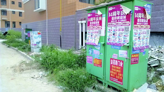 在李先生的指引下,记者来到了小区的38号楼前。在38号楼的墙外,记者看到了两个贴满广告的绿色配电箱,配电箱的箱底接出了很多较粗的电缆,这些电缆就铺在地上,看起来很不安全。
