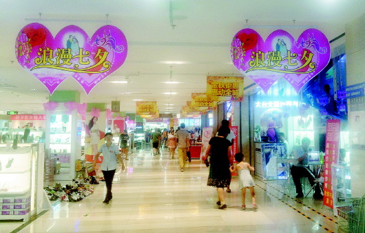 18日上午,记者在商中路上看到,不少商家已经开始提前进入“七夕模式”。贴满爱心的装饰,“以爱为名”的主题宣传,还有压轴出场的“七夕打折促销”,给即将来临的“七夕”造足了势。除了商场的促销,在各大超市,一些巧克力、红酒等也加入了促销的行列,精美的包装和创意的设计让不少市民感叹“这是要过节了啊”。市民王先生说:“这么大张旗鼓宣传,想要不知道过节都难。”