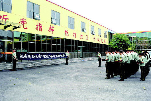 仪式上,支队长尤胜简要介绍了天津“8·12”灾情,沉痛地宣读了悼念词。全体官兵着装整齐,规范有序,庄严肃穆,集体脱帽为死难同胞默哀三分钟,向逝者致哀,向生者致敬。
