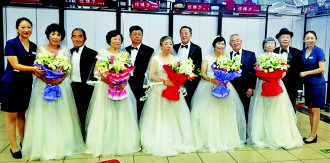 19日9时许,在社区工作人员带领下,5对金婚夫妇来到大世界商城二楼拍摄“迟来的”婚纱照。社区为5对金婚夫妇安排了专业化妆团队,也准备了漂亮礼服和鲜花。