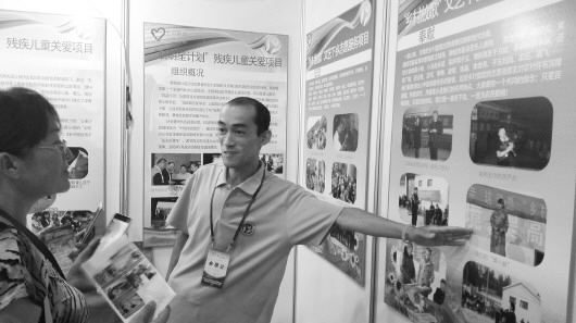 在山东省首届青年志愿者服务项目大赛上,靖德刚向观展者介绍“乡村放歌”公益项目。