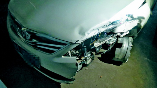 本报96706热线消息(记者 张泰来) 雨夜驾车撞了路边停放的车辆,肇事司机李某考虑到驾驶证处于暂扣期,选择了逃逸。由于撞击,车辆左前轮轮胎都脱落了,只剩下轮毂,即便这样,李某依然驾驶着“残疾”车前行了8公里。