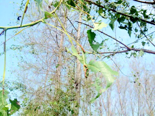近日,有不少村民反映自己村附近的树上大面积出现了一种叫“吊死鬼”的虫子,七天左右一棵棵茂盛的杨树就被这种虫子啃光了叶子。20日上午,记者在文昌街道办事处三龙村附近的小树林中看到,5分钟之内,三只“吊死鬼”就将一枚杨树叶啃坏。