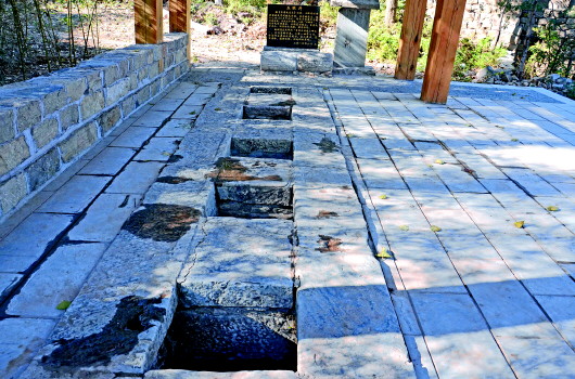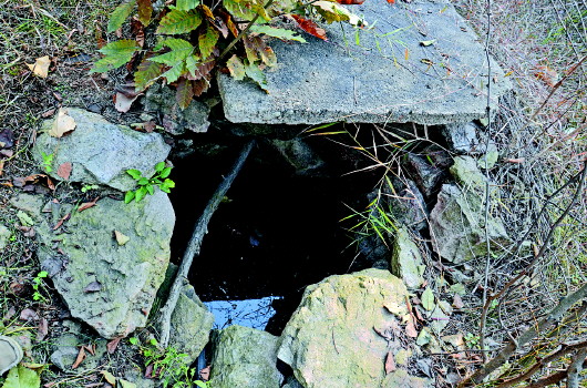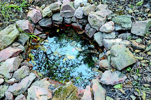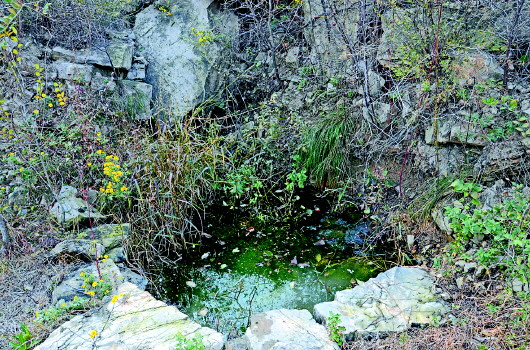 金蟾泉:位于五眼井泉的正上方,用石板盖住,隔着石板听到哗哗的水流声,泉口呈方形,有2米见方,水深有2米。该泉泉水被引到五眼井的饮用水池中,常年不干,无论多旱,都能听到流水声。因周边的奇石突兀,像一个个金蟾,所以取名金蟾泉。