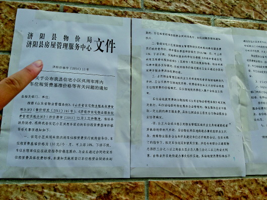采访中,记者发现王先生所在的小区门口张贴了由济阳县物价局、济阳县房屋管理服务中心出台的《关于济阳县住宅小区共用车库内车位租赁费基准价格等有关问题的通知》。文件中指出:住宅小区共用车库内的车位租赁费实行政府指导价,基准价格为130元/个·月,可上浮10%,下浮不限。