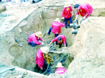 工人们在污水工作坑内清理淤泥,连接主管道。