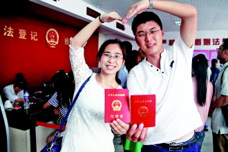 8月20日是传统节日七夕,不少年轻情侣选择在这一节日里领取结婚证,见证自己的幸福。据了解,截至20日下午5时,环翠区民政局共有123对新人登记,是平日登记数量的5倍。