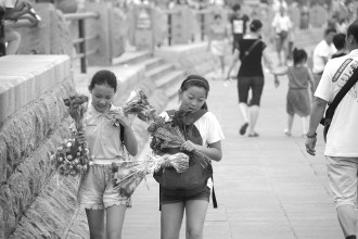 20日是农历“七夕”,当天在市区幸福公园内,两位小学生手持鲜花在路边售卖。