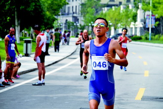 临近终点,铁人们互不相让(资料片)。 记者 陈乃彰 摄