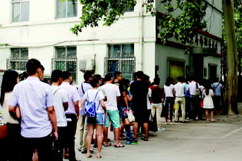 “七夕”当天一早,张店区民政局婚姻登记处就挤满了登记领证的情侣。 见习记者 李洋 摄