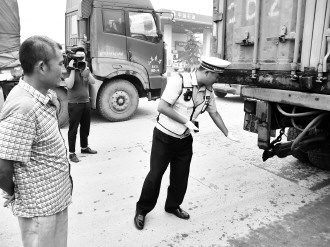 等交警绕到车辆后方才看到了最严重的问题,这辆货车后部的保险杠竟然完全不见了。民警告诉记者,大货车后面要装保险杠是为了防止后面车辆追尾造成较大的事故而规定的,这属于硬性规定必须安装。如没有后面的保险杠大货车货箱与地面会形成一个非常大的空隙,一旦有小型车辆追尾,就会被挤到大货车的下面去,异常危险。对于这一问题大货车司机有些含糊其辞,后来表示应该是有一次卸货把保险杠撞掉了,后来没有再装。民警称这种情况属于安全设施不全的范畴,现场给予了罚款200元的处罚,并且要求大货车司机及时改正。