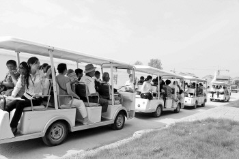 老人们乘坐中华水上古城景区观光游览车游览景区。