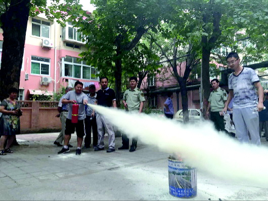 本报8月21日讯(记者 王倩) 20日上午,在二七新村辖区铁二社区一居民楼前,消防人员正在教居民使用干粉灭火器。这些干粉灭火器已经按照统一标准安置在辖区224栋开放式小区楼道内,每个单元楼配备两组4个这样的干粉灭火器。