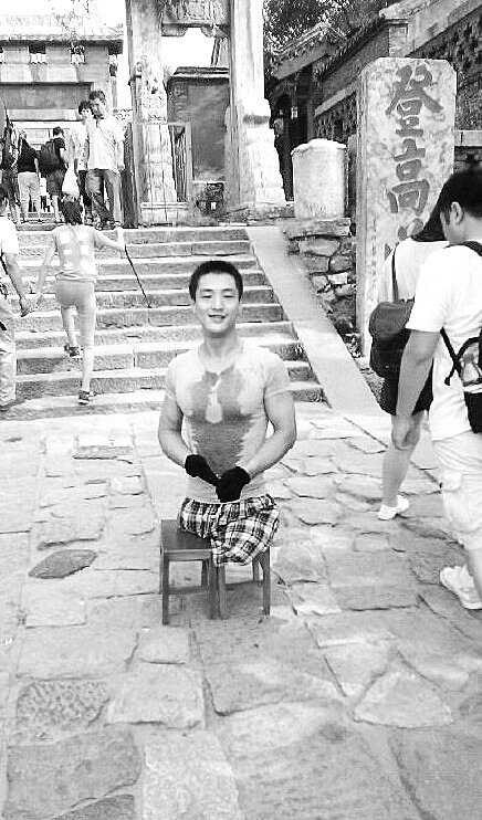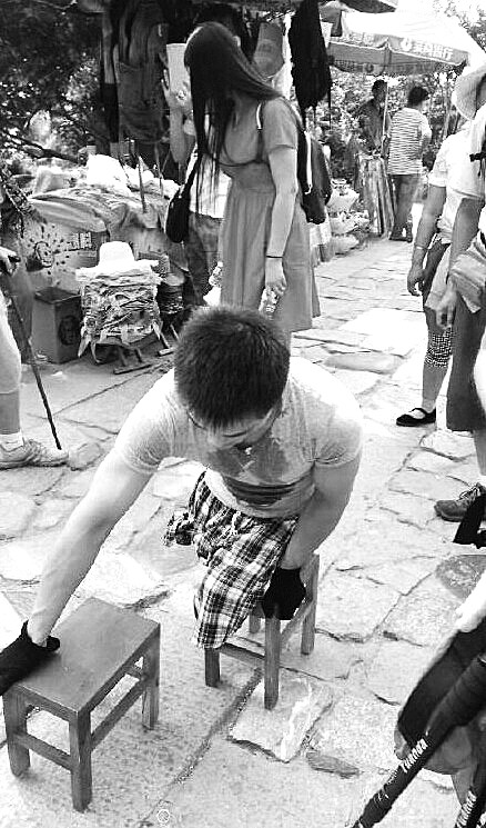虽然身体有残疾,但是赵博阳光帅气,双臂肌肉发达,也很爱笑,游客给他加油时他还竖起大拇指回应。“我们一路爬上来都觉得体力不支,他能靠双臂撑到中天门,实在令人佩服。”很多游客赞叹。