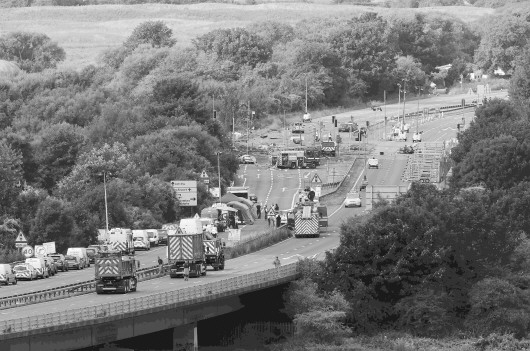 据新华社8月23日电 一架老式战斗机22日在英国东南部西萨塞克斯郡的肖勒姆航展作飞行表演时坠入一条繁忙公路。当天下午,英军退役飞行员希尔驾驶一架老式“霍克猎人”式喷气式战机作飞行表演,在作一个筋斗滚翻动作时,飞机高速冲向地面,却未能及时拉起,贴着树梢撞向公路,立即爆炸成一个巨大火球,升起滚滚黑烟。至少两辆汽车遭飞机削去车顶,地面散落着燃烧的残骸。