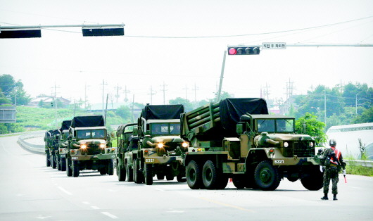 23日,韩国军队在韩朝边界地区调动武器装备。