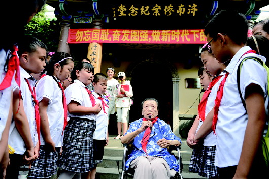 8月20日上午,山大一附小三年级2班的少先队员们,来到了济南趵突泉风景区内的五三惨案纪念馆。少先队员们讲解了济南惨案纪念堂内的牌坊题词、五三亭、五三钟、五三碑的历史由来。活动特别邀请了蔡公时烈士的女儿蔡今明奶奶给孩子们讲解了蔡公时烈士的生平事迹,五三惨案经过及抗战胜利带给中国的意义。