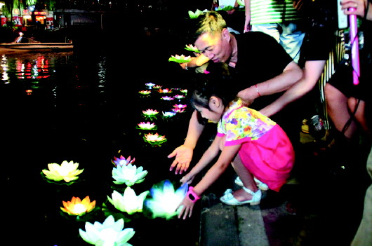 20日晚,护城河边,济南市民在按照老传统放荷灯。 本报记者 周青先 实习生 刘海天 摄