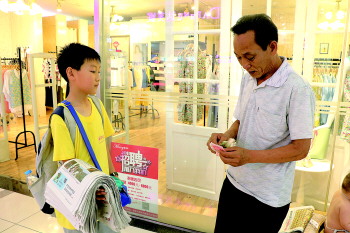 虽然参加营销秀的时间比较晚,但徐升泰的卖报份数却不少。他每天的卖报数量都在180份以上,最多的时候预订了240份报纸。在大润发商场,徐升泰忙碌的身影总是那么扎眼。汗水湿透了T恤衫,腿又酸又软,但徐升泰总是坚持卖完报纸再回家。在卖报过程中,徐升泰礼貌待人,每卖出一份报纸,都不忘说一声谢谢。遇到和自己同时卖报的小报童,徐升泰还会绅士地把“销售旺地”让给年龄小的或者女孩子,然后自己去其他地方售报。