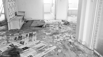 ▲客厅地面上,除了报纸是户主留下的,其余的沙土、灯罩碎片等垃圾都是“熊孩子”们留下的。